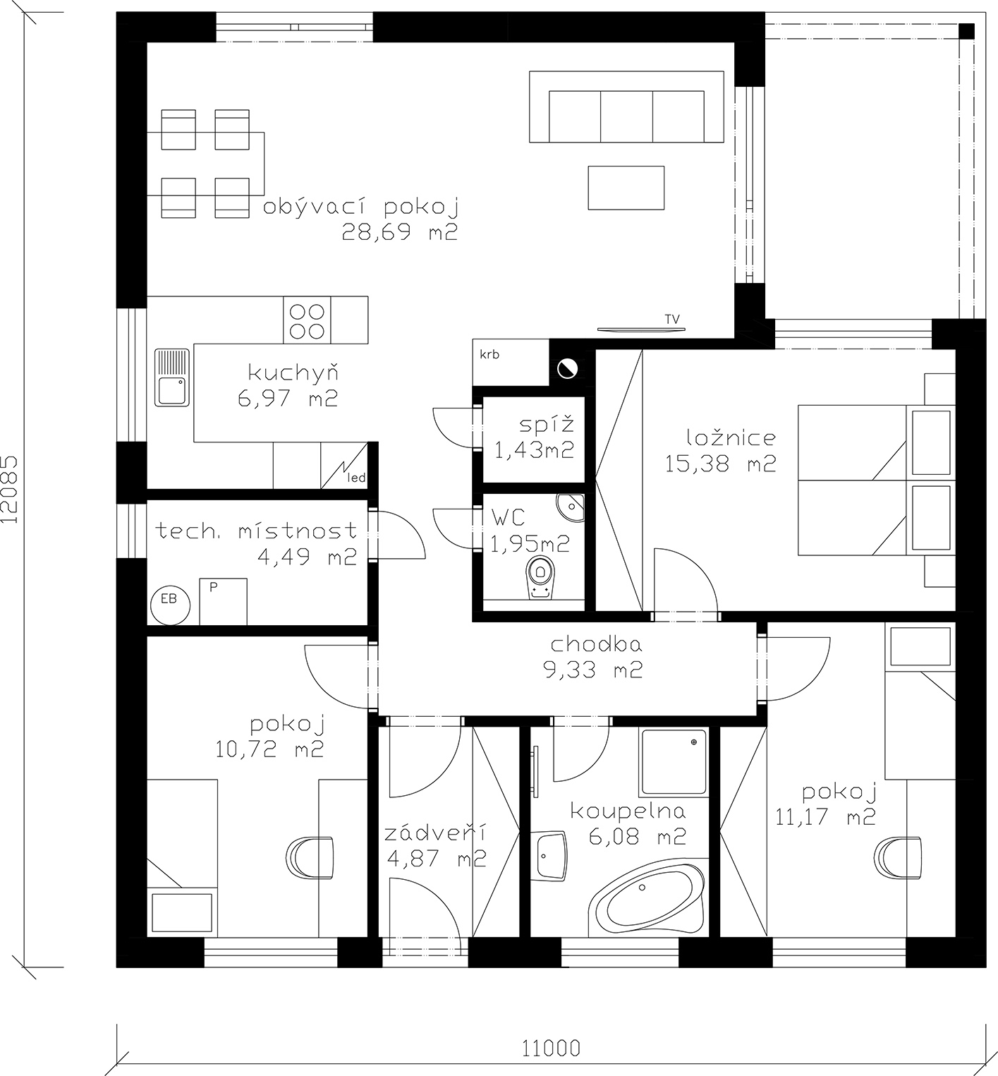 Najdete v něm celkem 3 ložnice, koupelnu, samostatné WC, technickou místnost a úložné prostory v zádveří i na chodbě.