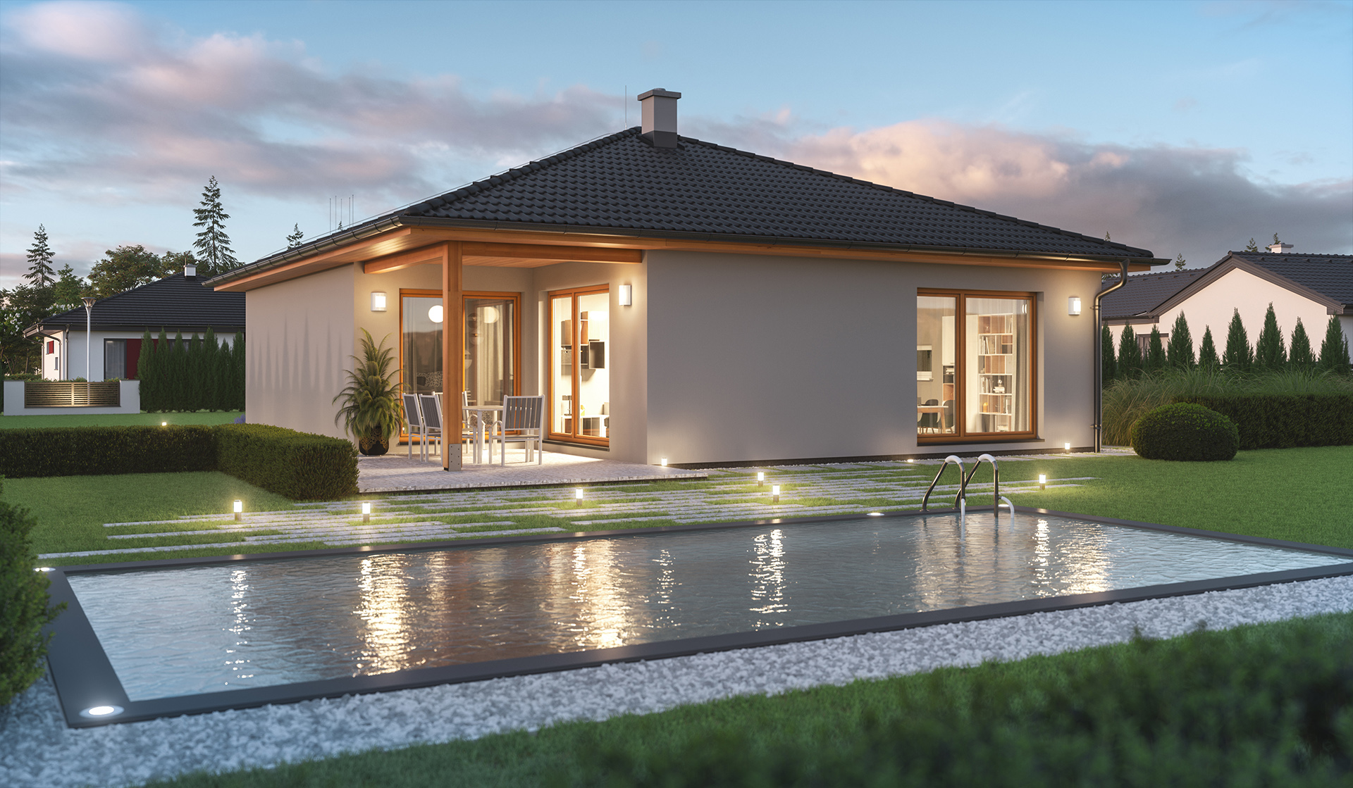 Dům je svým kompaktním tvarem vhodný i na menší pozemky.