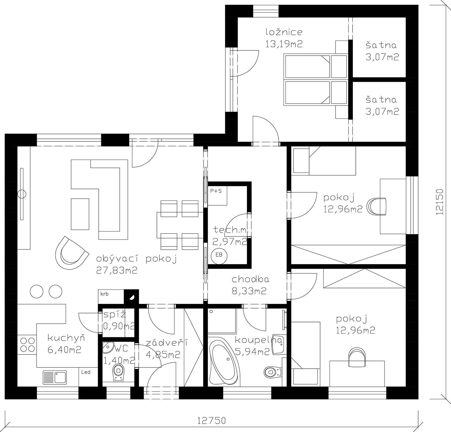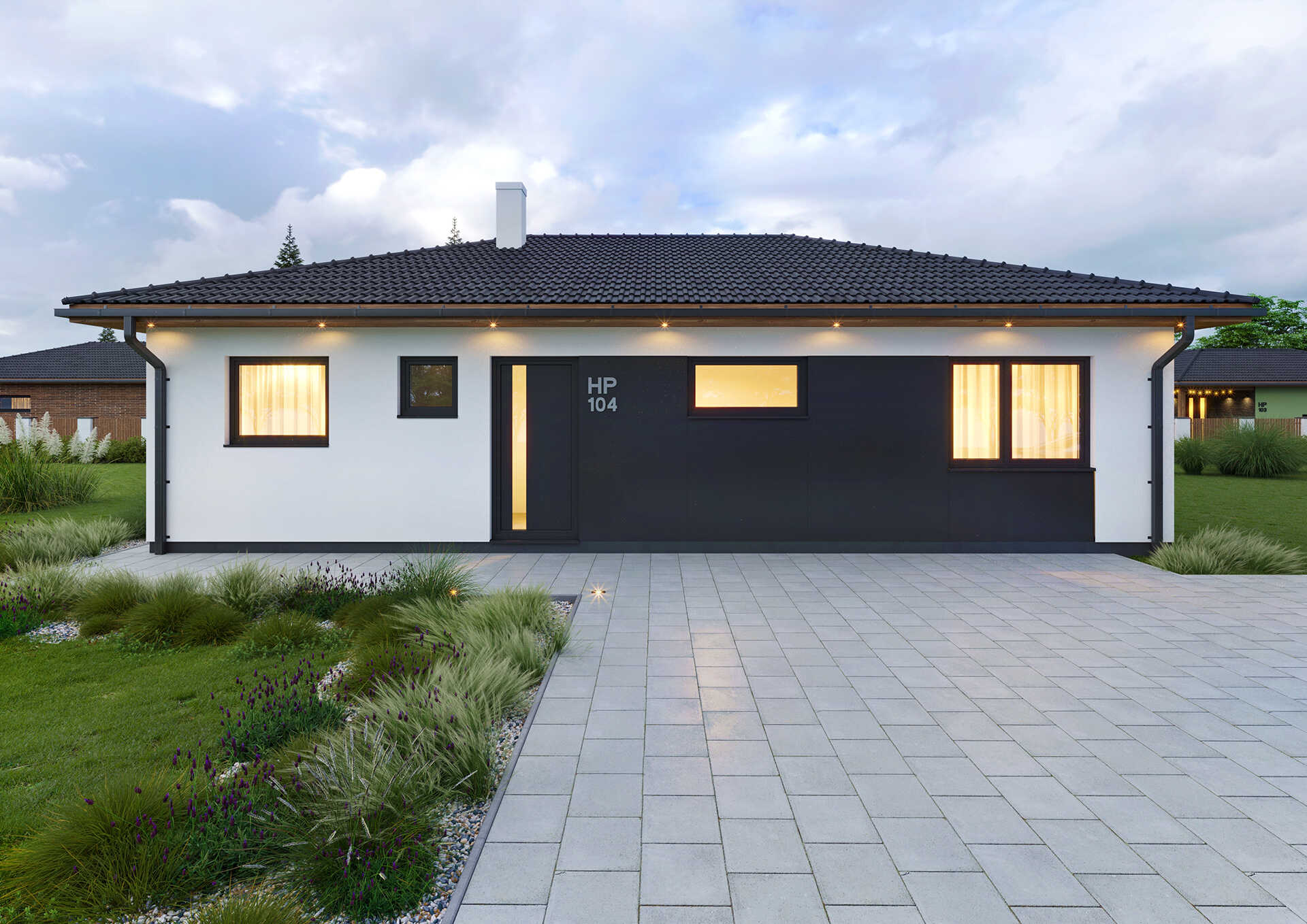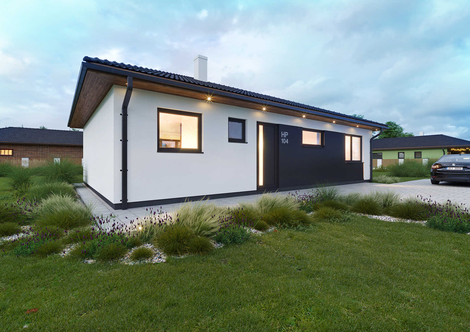 Moderní bungalov HP104L ve tvaru L o celkové užitné vnitřní ploše 103,87m2 a dispozici 4+kk je vhodný pro pozemky o šířce od 18,3 m.