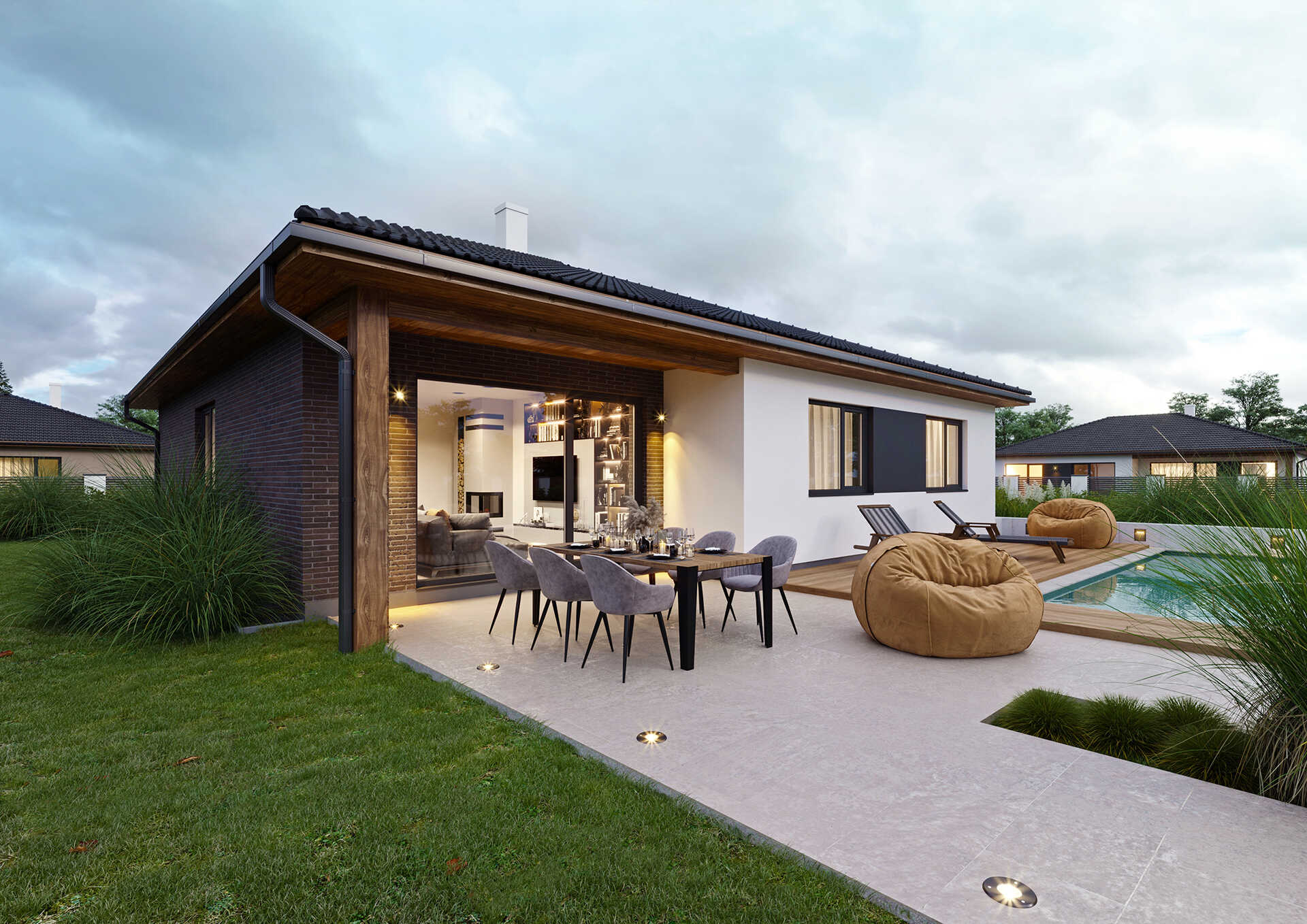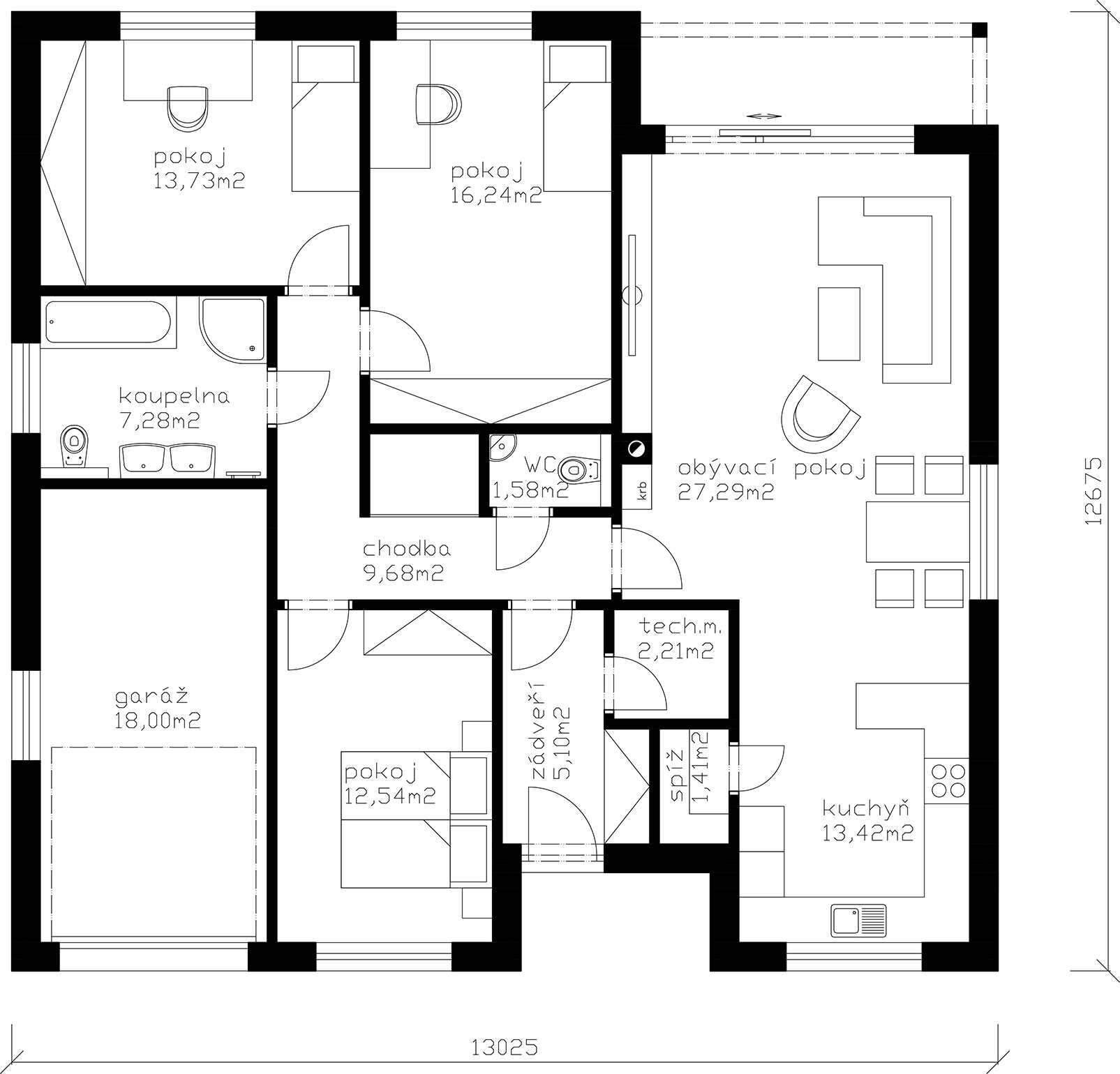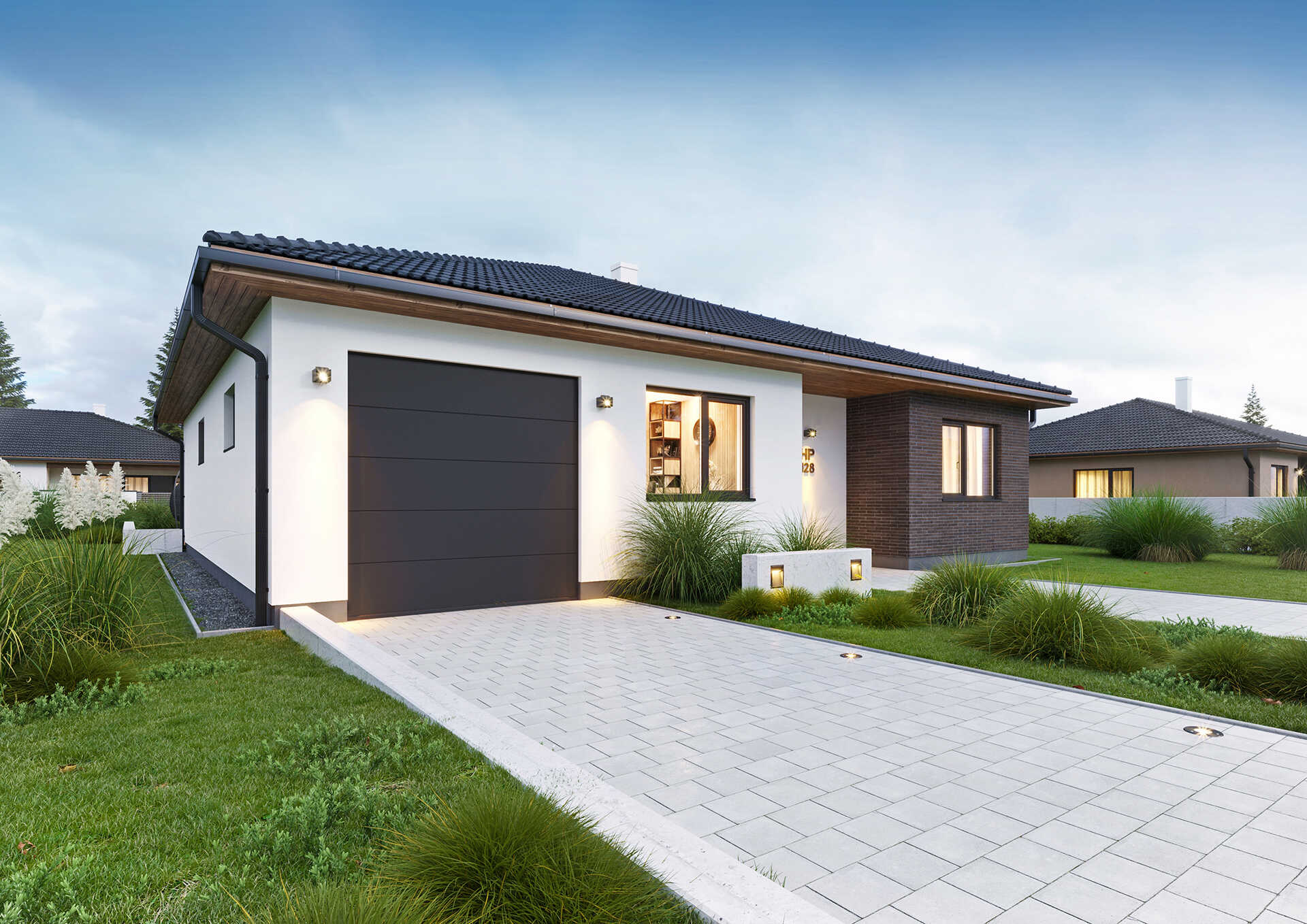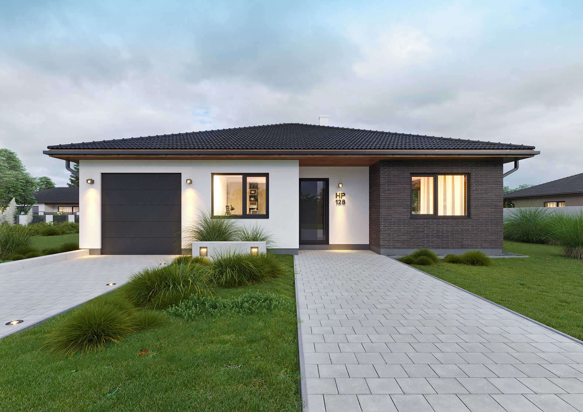 Moderní bungalov HP128 o celkové vnitřní užitné ploše 127,24 m2 s dispozicí 4+kk s garáží vám nabídne dostatek prostoru i pro větší rodinu a bezpečí pro vaše auto. Je vhodný na středně široké pozemky již od 17m.