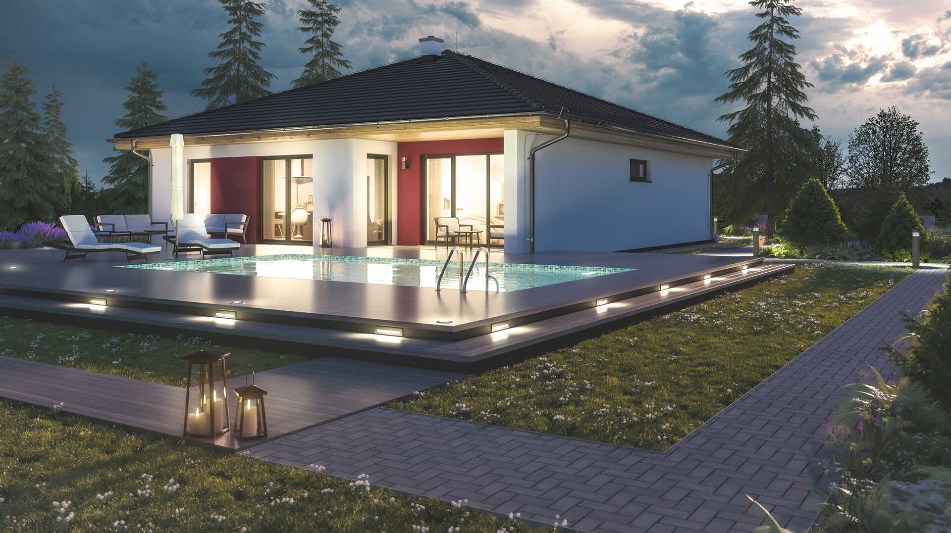 Moderní bungalov s valbovou střechou o dispozici 4+kk s garáží.