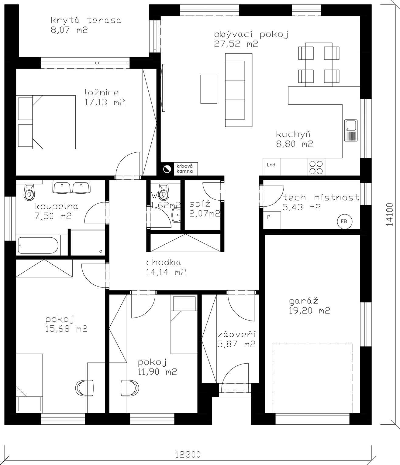 Dominantou domu je obývací pokoj s kuchyní se vstupem na krytou terasu. Naopak dětské pokoje jsou situovány v přední části domu.