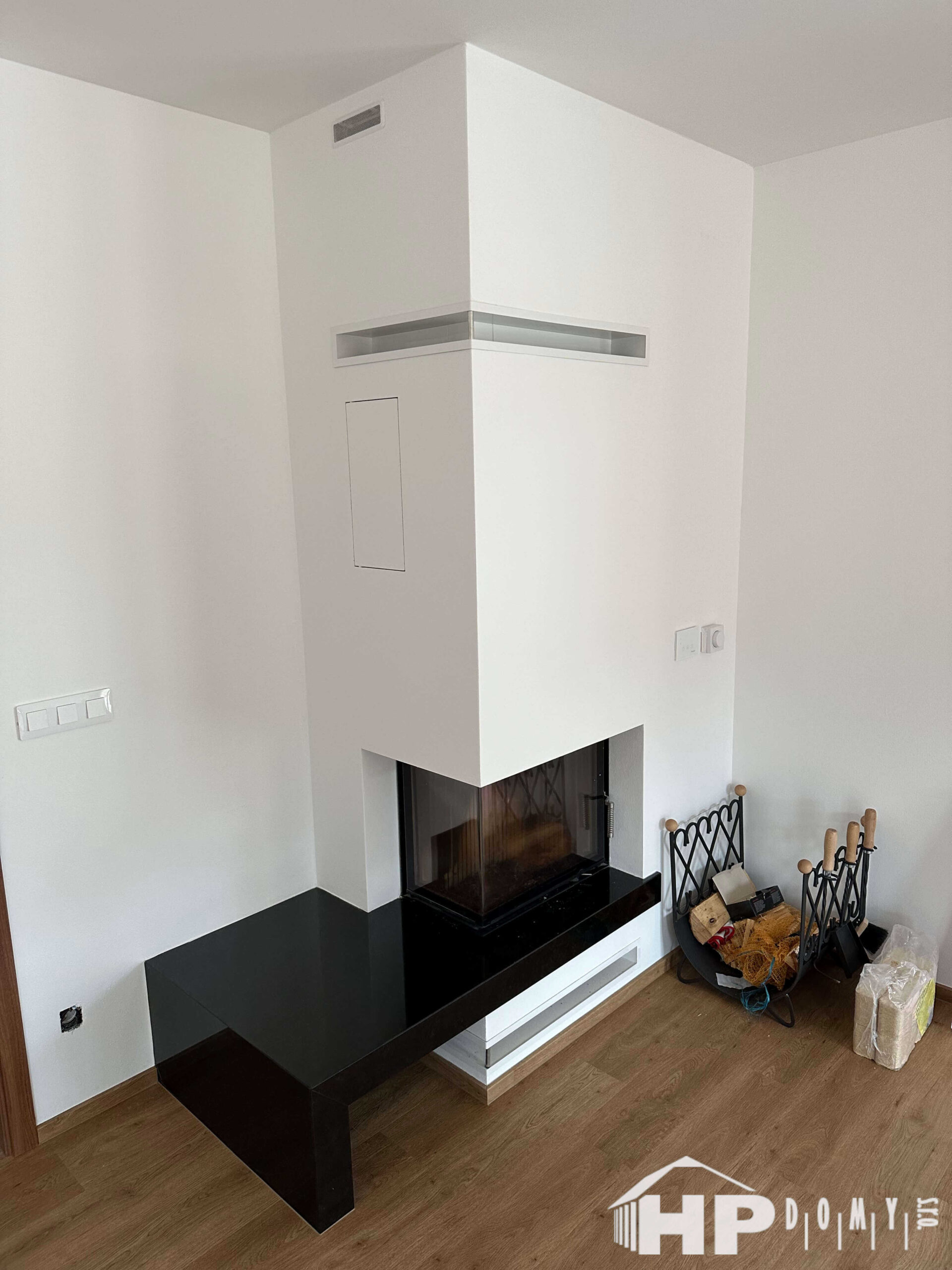 Na přání klienta je v domě instalována krbová vložka v rohové obestavbě.